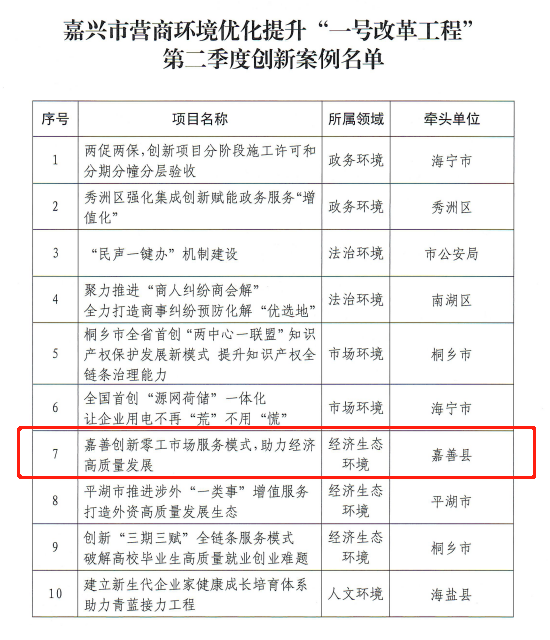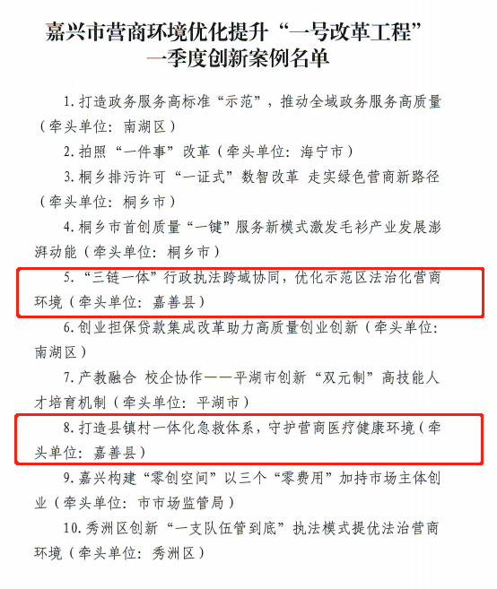 今年以來,嘉興市組織開展了兩批次營商環境優化提升“一號改革工程”創新案例評選。縣委改革辦協同各專項小組廣泛發動、深入挖掘,會同項目牽頭單位研究會商、反復打磨。經過現場路演評比,最終我縣《“三鏈一體”行政執法跨域協同,優化示范區法治化營商環境》《打造縣鎮村一體化急救體系,守護營商醫療健康環境》《創新零工市場服務創新模式,助力經濟高質量發展》3項改革案例成功入選。